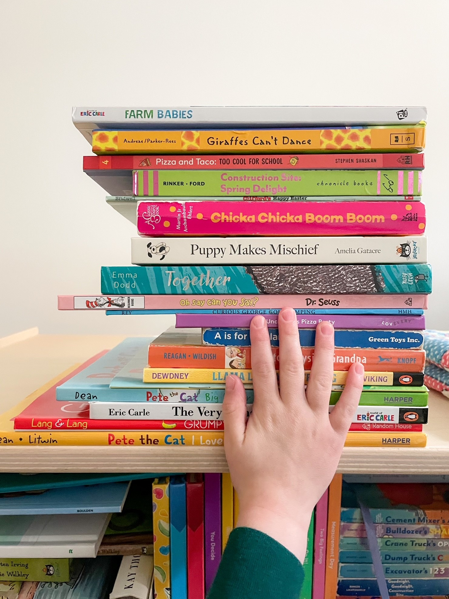 But! I read to the Pamper Pirate, a solid four books a night. We are raising a bookworm, or at the very least a mischievous young boy who likes to avoid lights out. Towards the end of the month, I started to stack the books we read every night atop his bookcase / toy box in order to track those and direct him to pick and cycle through new ones still in his bookcase. And yes, he has books we have only read once.